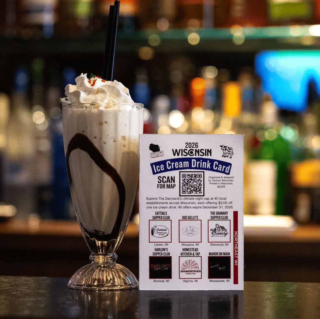 That’s the idea behind the Ice Cream Drink Card from Venture Wisconsin. It gives you $2 off delicious ice cream drinks from 40 of the best supper clubs and bars in the state.